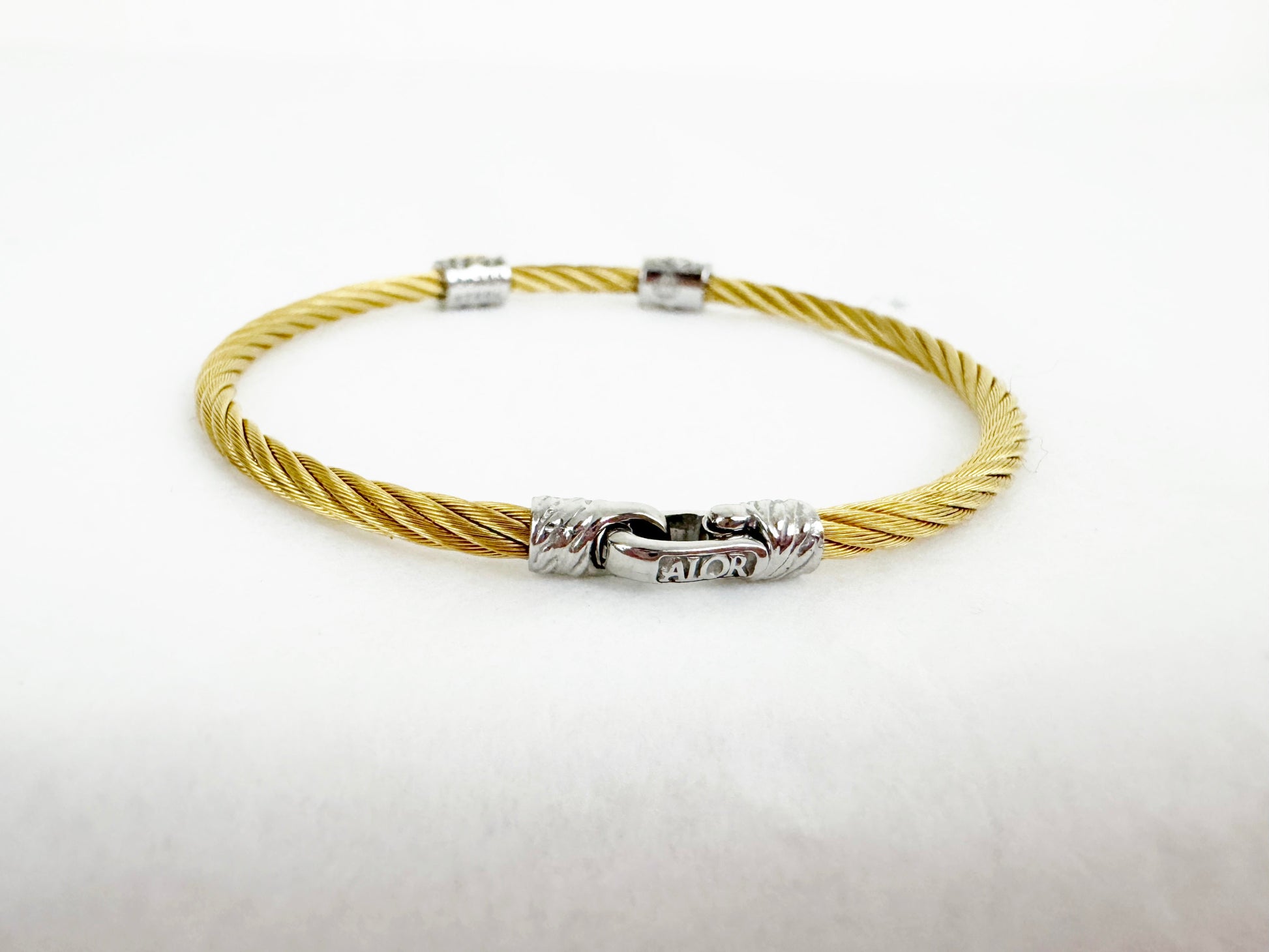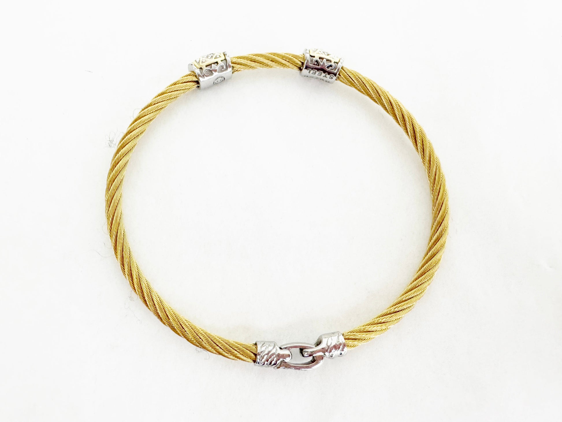 Description: Stainless steel cable bracelet with 2 round stations of less then .15 ct diamonds, 14k yellow gold, and pull back clasp.