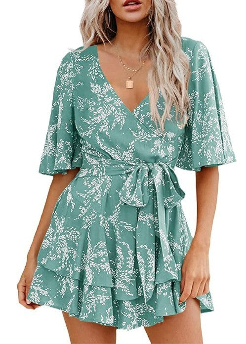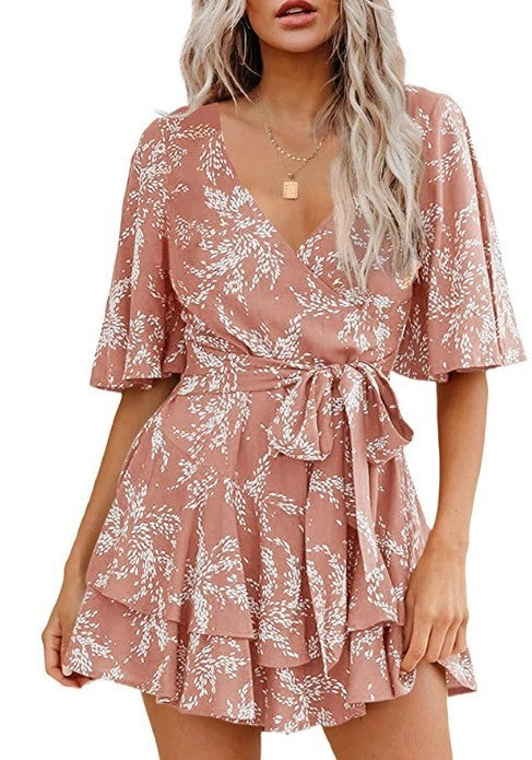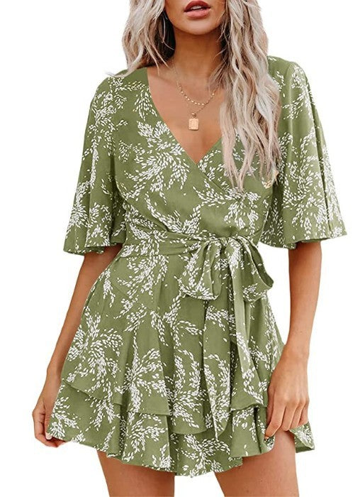 Robe plissée florale à col en V, manches évasées et ceinture à la taille