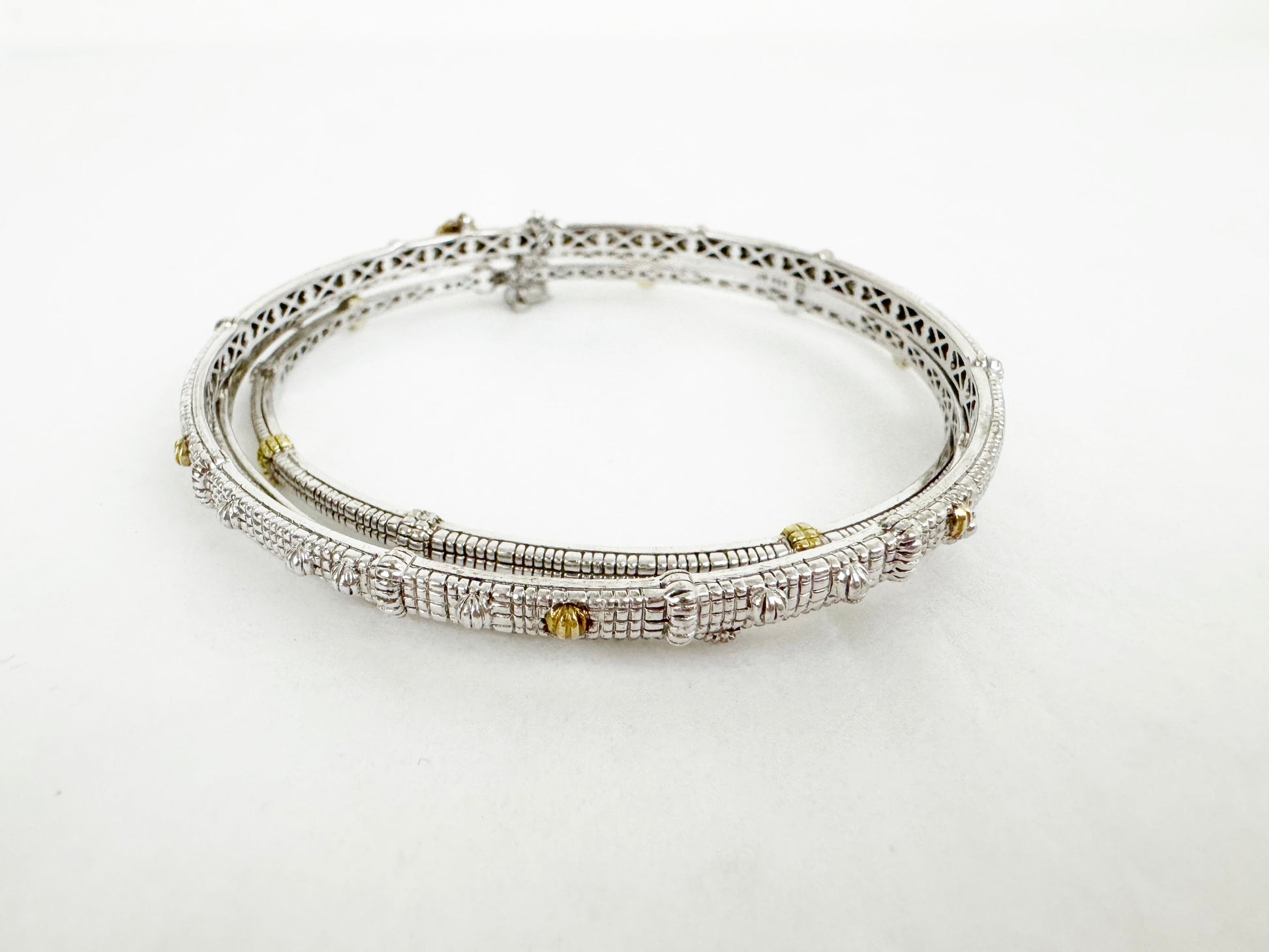 Description: Trio of three 18k and sterling bracelets linked by removable chain with various 18k gold and sterling stations throughout
