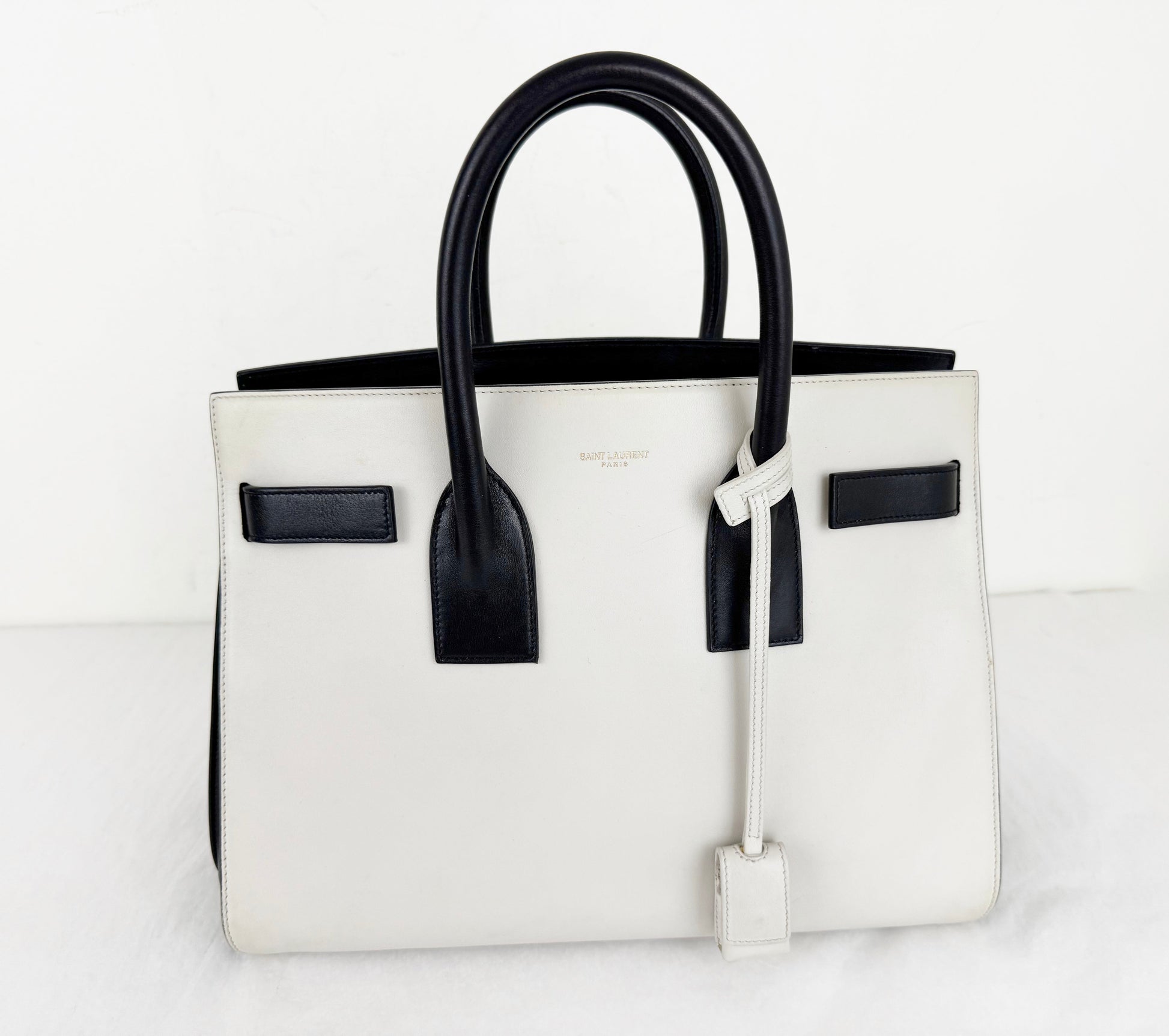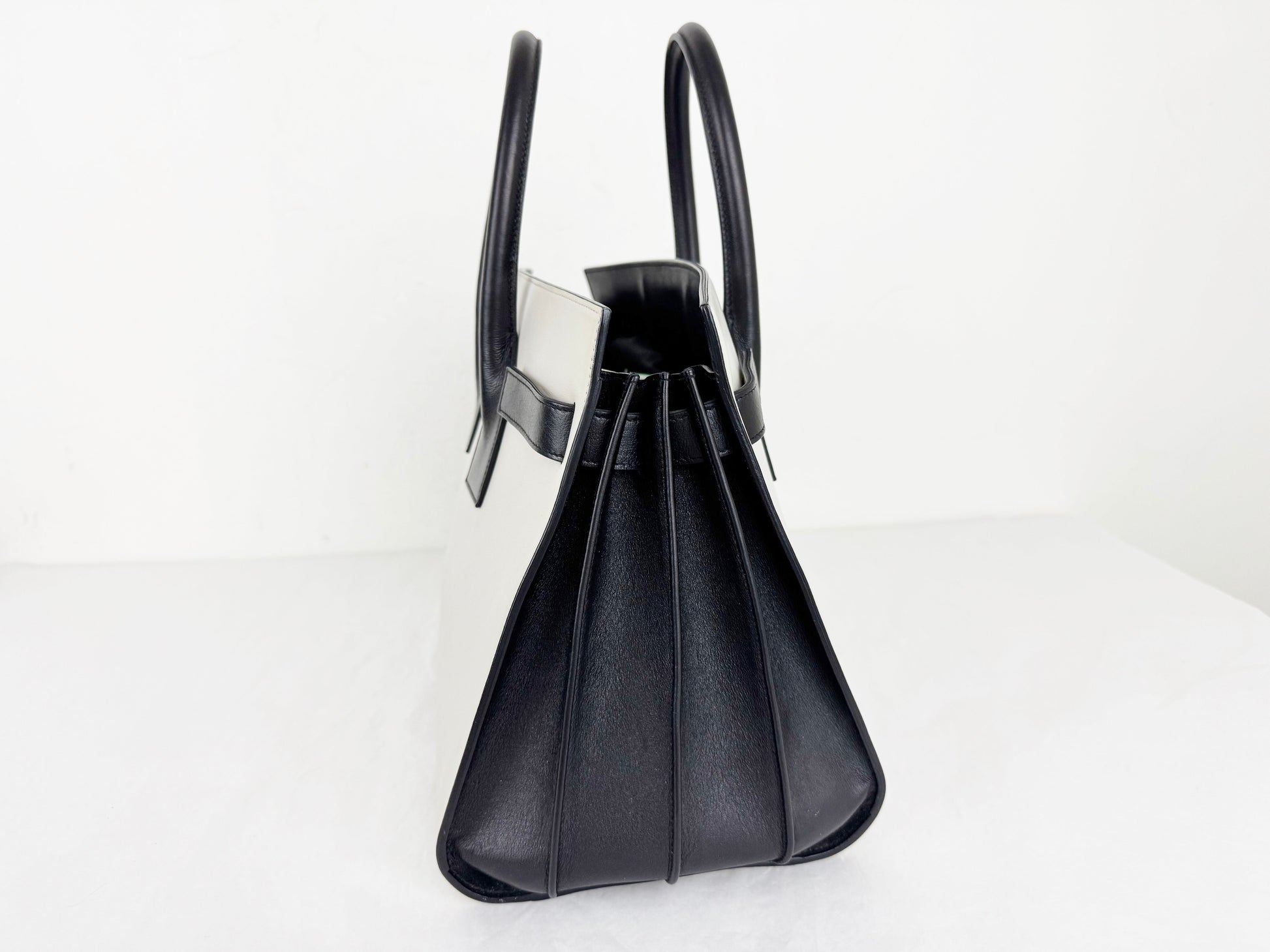 Description: Two tone handle leather bag, rolled handles, open center with zip center compartment, three interior pockets, suede lining, removable flat shoulder strap, belted front cinches sides, lock with keys, gold tone hardware and protective feet. Includes dust bag.
