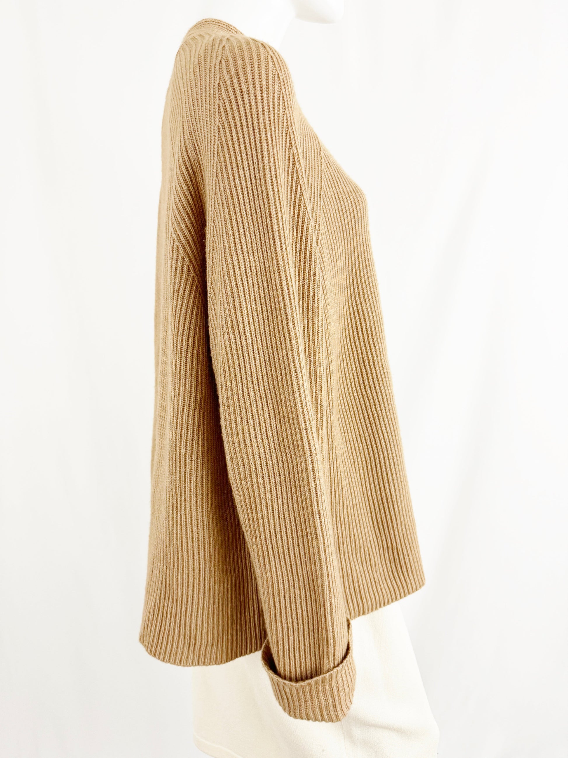 Description: Oversized light brown cashmere and silk mock neck sweater.