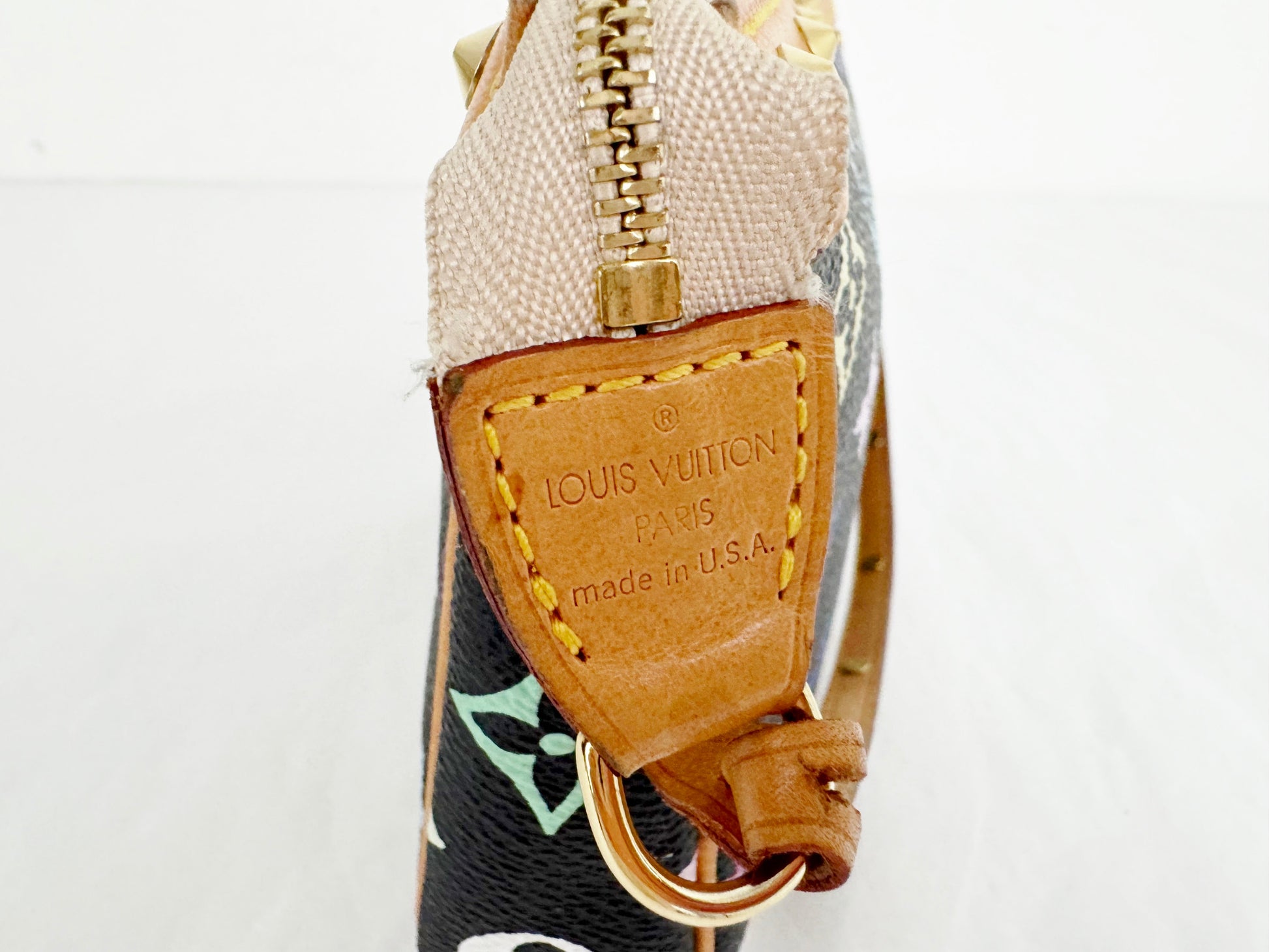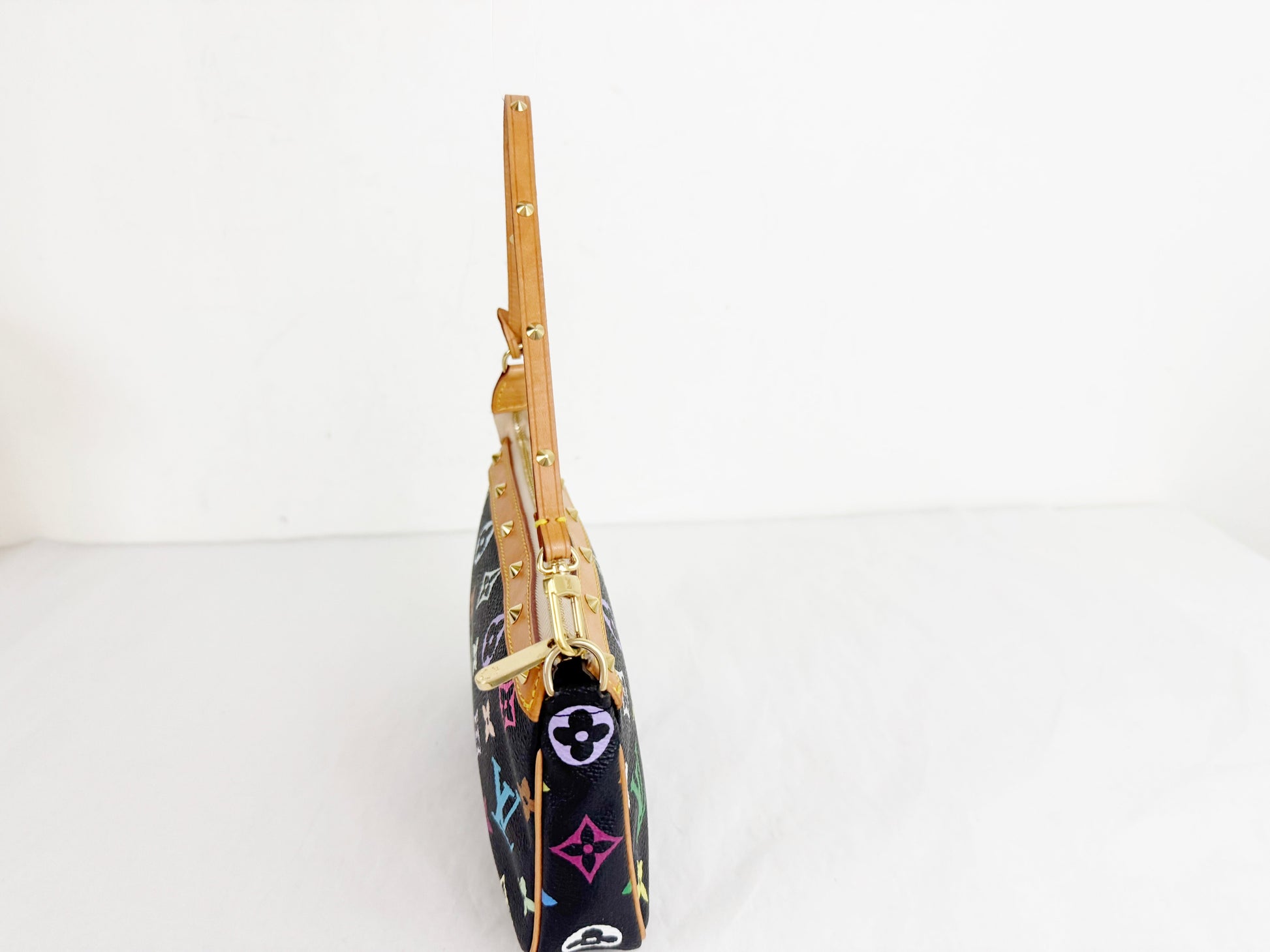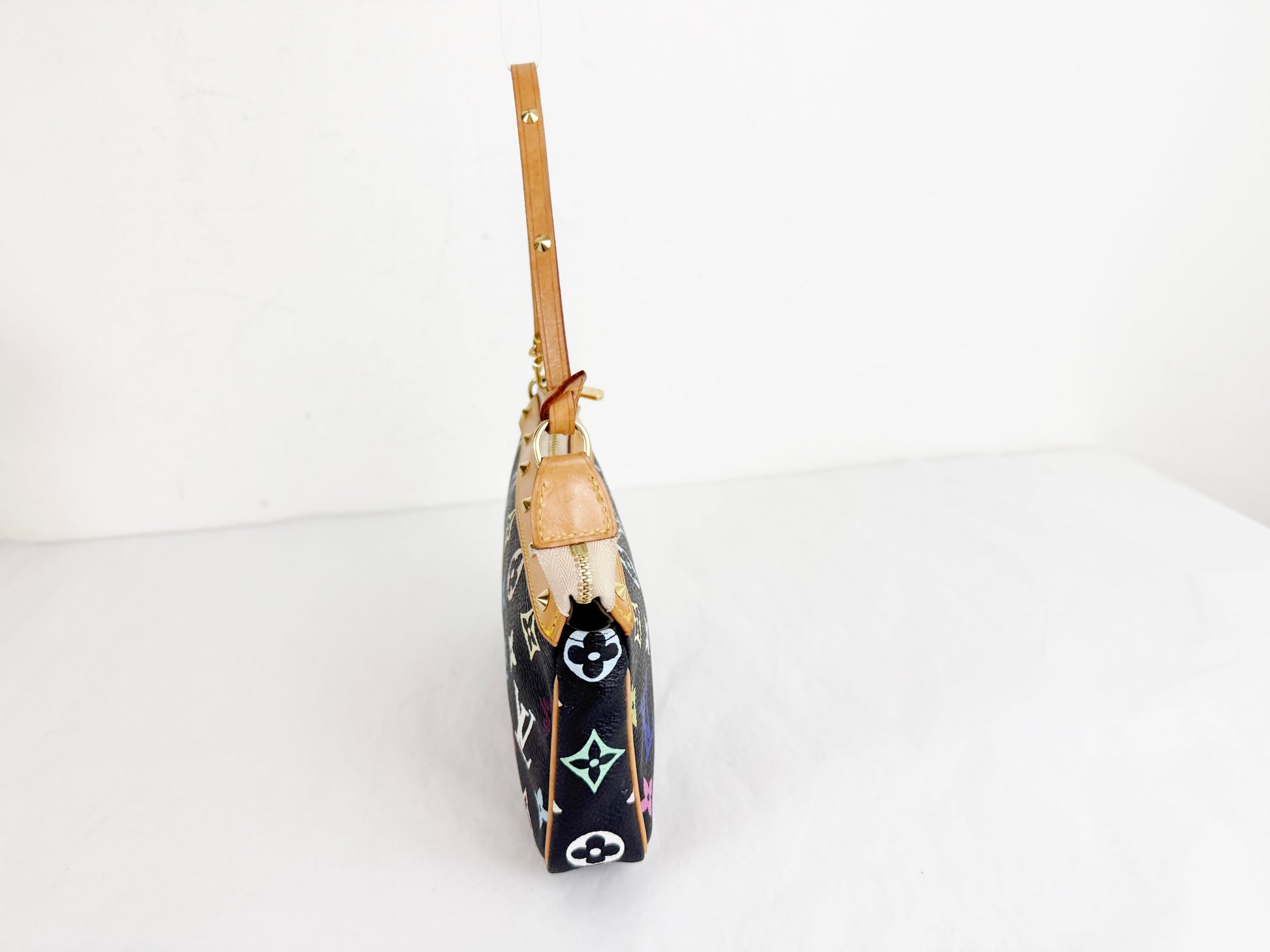 Description: 2004 Pochette featuring multicolor logo on black coated canvas with brass studs, vachetta leather strap and trim, top zipper closure that opens to a taupe microfiber interior.